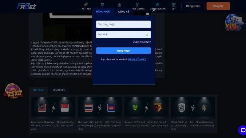 Đăng ký đăng nhập Fabet là bước đầu tiên để bạn tiếp cận thế giới cá cược trực tuyến hấp dẫn, nơi mang lại cơ hội thắng lớn và trải nghiệm giải trí chất lượng cao. Với Fabet, quy trình này không chỉ đơn giản mà còn an toàn, giúp người dùng dễ dàng tham gia các trò chơi thể thao, casino và nhiều lựa chọn khác. Hãy cùng khám phá cách thực hiện Đăng ký đăng nhập Fabet một cách hiệu quả để bắt đầu hành trình của bạn ngay hôm nay.