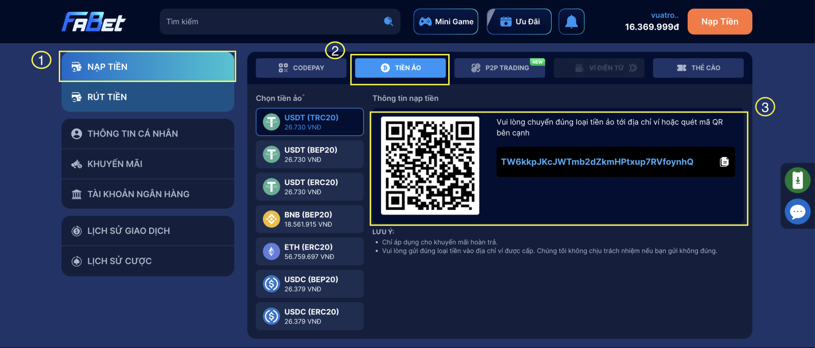 Các phương thức nạp tiền trên Fabet