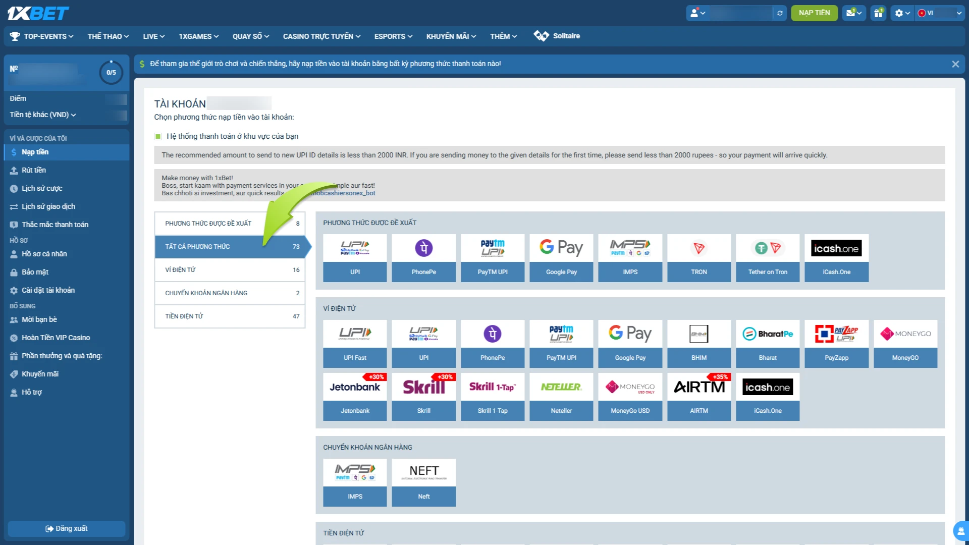 Trước hết, người chơi cần đăng nhập vào tài khoản cá cược của mình tại 1xbet và cập nhật đầy đủ thông tin cá nhân, liên kết phương thức thanh toán phù hợp. Điều này đảm bảo giao dịch của bạn sẽ diễn ra khớp với dữ liệu đã đăng ký, tránh những tranh chấp hoặc lỗi hệ thống.