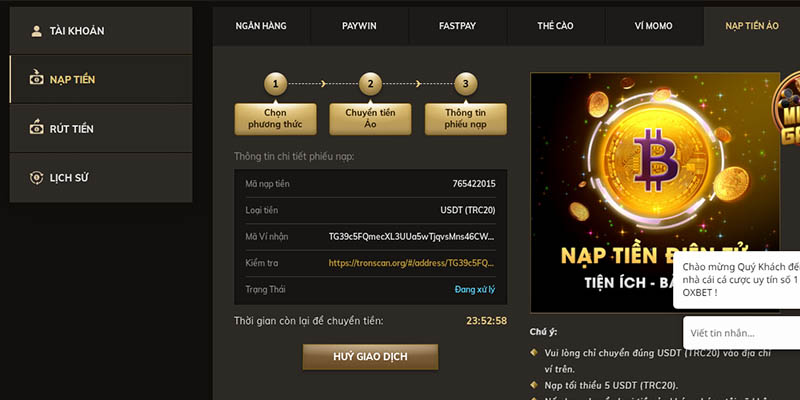 Phương thức nạp tiền phổ biến nhất là chuyển khoản ngân hàng. Đây là hình thức truyền thống, dễ thực hiện và phù hợp cho mọi đối tượng. Tuy nhiên, thời gian xác minh có thể kéo dài từ vài phút đến vài giờ, tùy thuộc vào ngân hàng và hệ thống của Oxbet. Người chơi cần đảm bảo cung cấp đúng thông tin tài khoản để tránh sai sót gây trì hoãn.